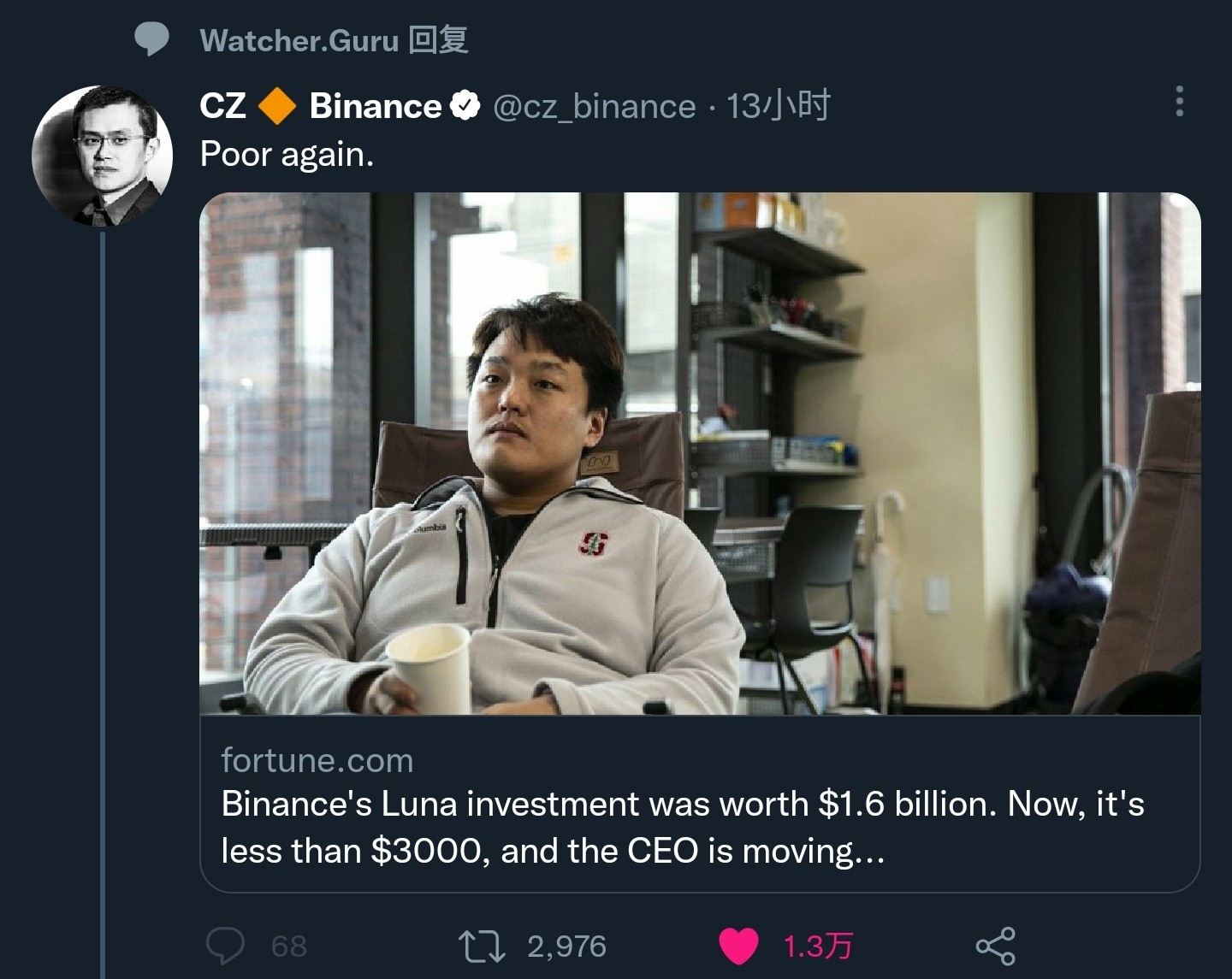 币安集团是 Luna 背后运营团队多年以来的重要客户,同样是在 2018 年,币安向 Terraform Labs 投资了三千二百多万美元,然后一举成为其核心股东,这也加速了后者“基于区块链构建现代化经济体”的构想实现。然而现在看来,他们之间的关系有点僵化。赵长鹏表示他对 Terra 团队面对这种局面所做出的种种措施“极度失望”,尤其是当他听说 Terraform Labs 首席执行官 Do Kwon 竟然想要 fork Luna 币(或者干脆构造一个新的区块链,然后把新币种分发给所有之前的 Luna 持币者)的时候。赵长鹏非常反对这种做法,还表示“这压根就没用”。