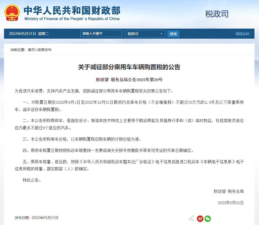 一、对购置日期在2022年6月1日至2022年12月31日期间内且单车价格(不含增值税)不超过30万元的2.0升及以下排量乘用车,减半征收车辆购置税。