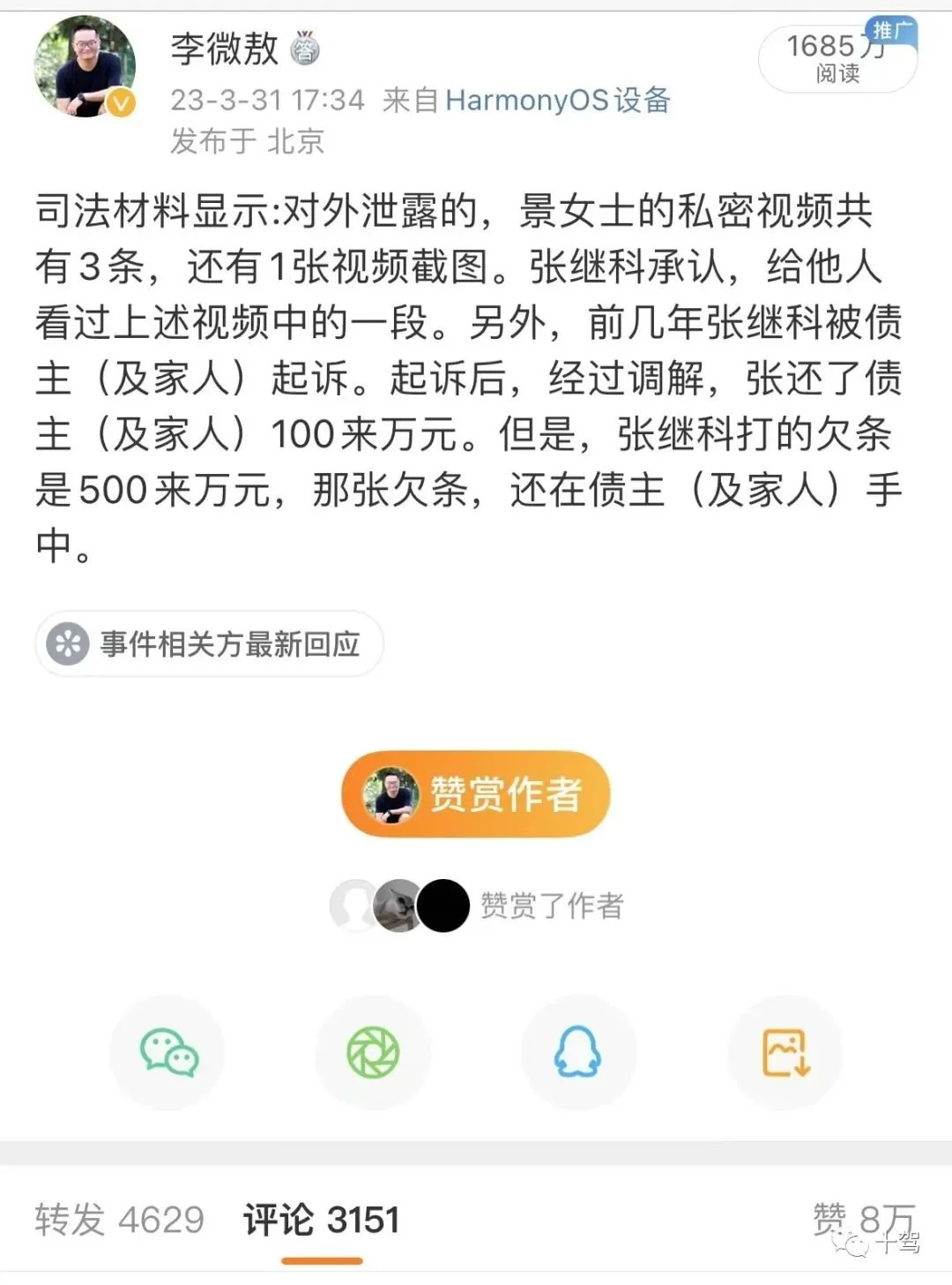 后来,有武汉的朋友们告诉我,一位武汉的S先生,张继科先生欠他很多的钱,于是S先生向张讨债。在此前后,张继科先生给了几段明星景女士的隐私视频给S先生。S先生转而向景女士要钱,结果景女士报案,S先生在2020年2月被抓。