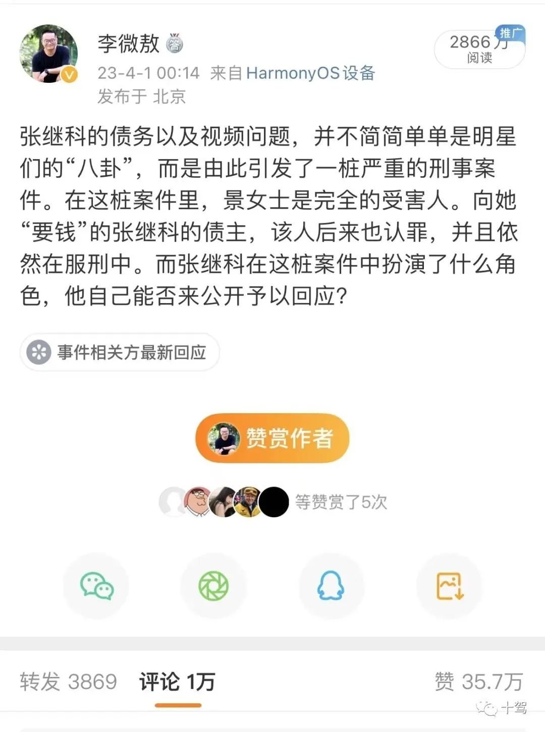 直到今天,4月2日下午,还不断有朋友来问我,为什么要发那几条微博,我所说的是否属实等等。他们也转来新闻讲,张继科先生的律师“马上准备起诉”云云。