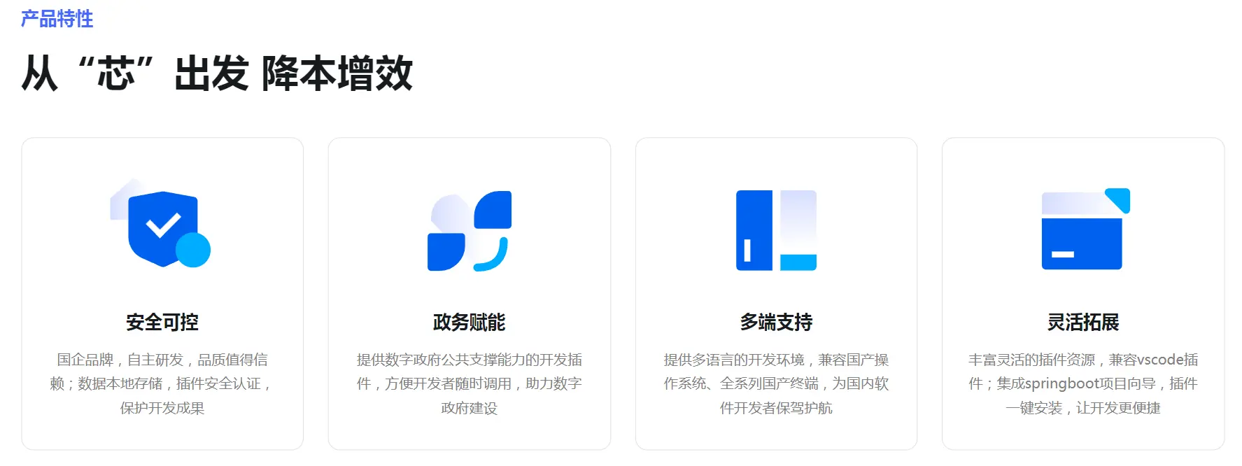 安全可控: 国企品牌,自主研发,品质值得信赖;数据本地存储,插件安全认证,保护开发成果。