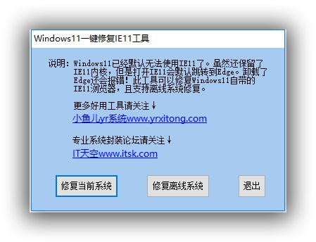 微软已经推出Windows11的预览版,但Windows11已经默认无法使用IE11了。虽然还保留了IE11内核,但是打开IE11会默认跳转到Edge浏览器。卸载或精简了Edge浏览器还会报错!此工具可以修复Windows11自带的IE11浏览器,且支持离线系统修复和PE里对目标系统修复。并且在桌面修复的情况下可以创建IE11桌面图标。