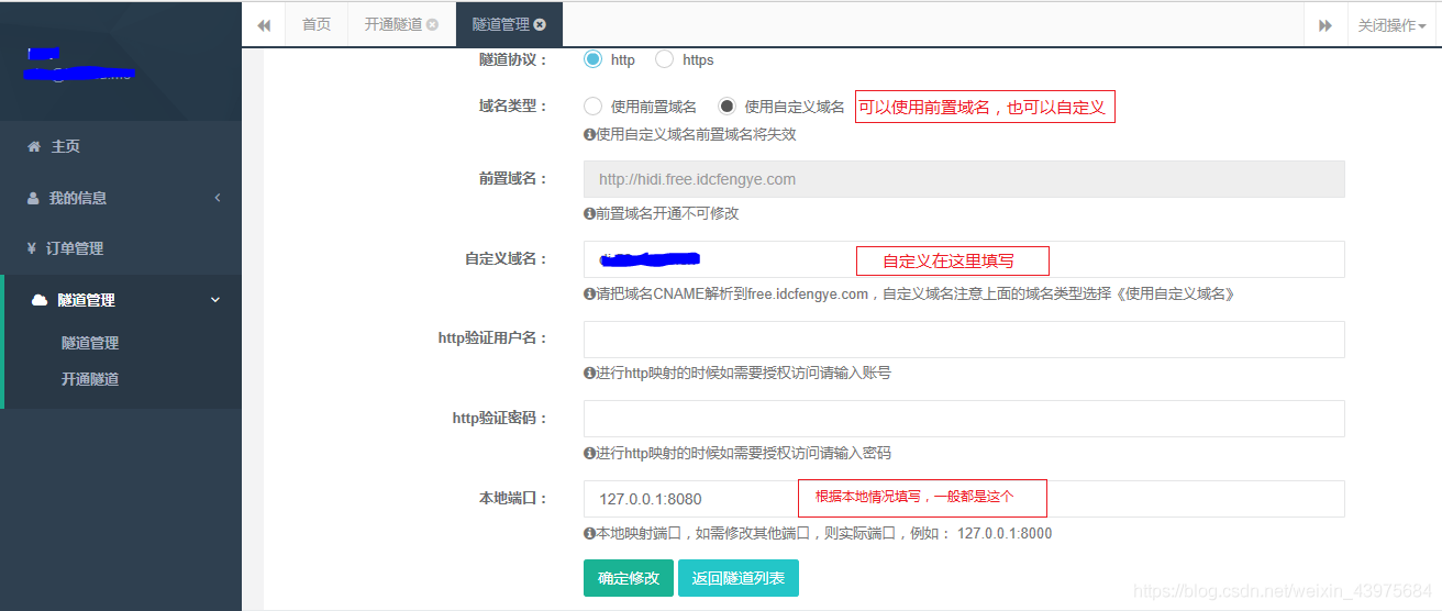 12.开通后对隧道进行配置,具体配置如下图,配置完成后记住clientid,下面要用到!