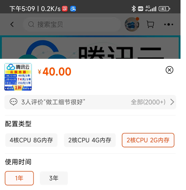 可以直接搜淘宝:腾讯云服务器(笔者用的事2核4g版本,一年不过70左右)